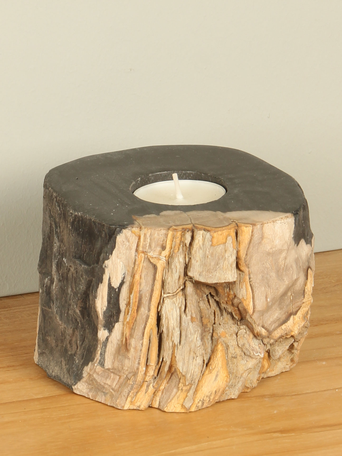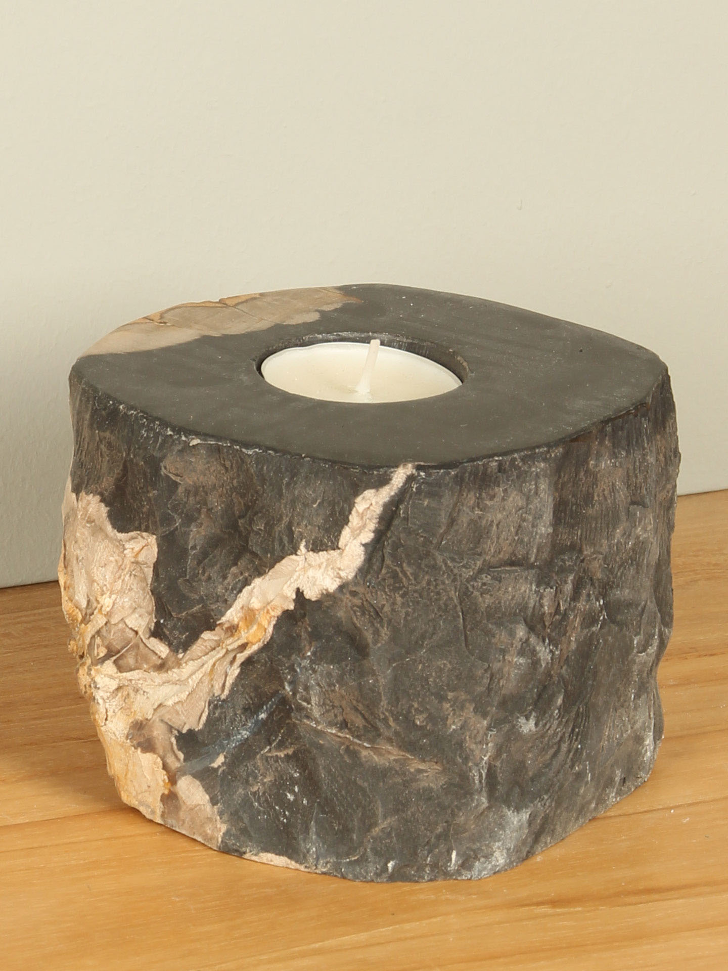 Dit unieke waxinelichtje is gemaakt van versteend hout, een prachtig natuurproduct dat miljoenen jaren geleden werd omgezet in steen.