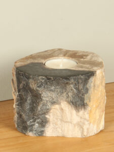 Dit unieke waxinelichtje is gemaakt van versteend hout, een prachtig natuurproduct dat miljoenen jaren geleden werd omgezet in steen.