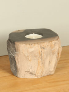 Dit unieke waxinelichtje is gemaakt van versteend hout, een prachtig natuurproduct dat miljoenen jaren geleden werd omgezet in steen.
